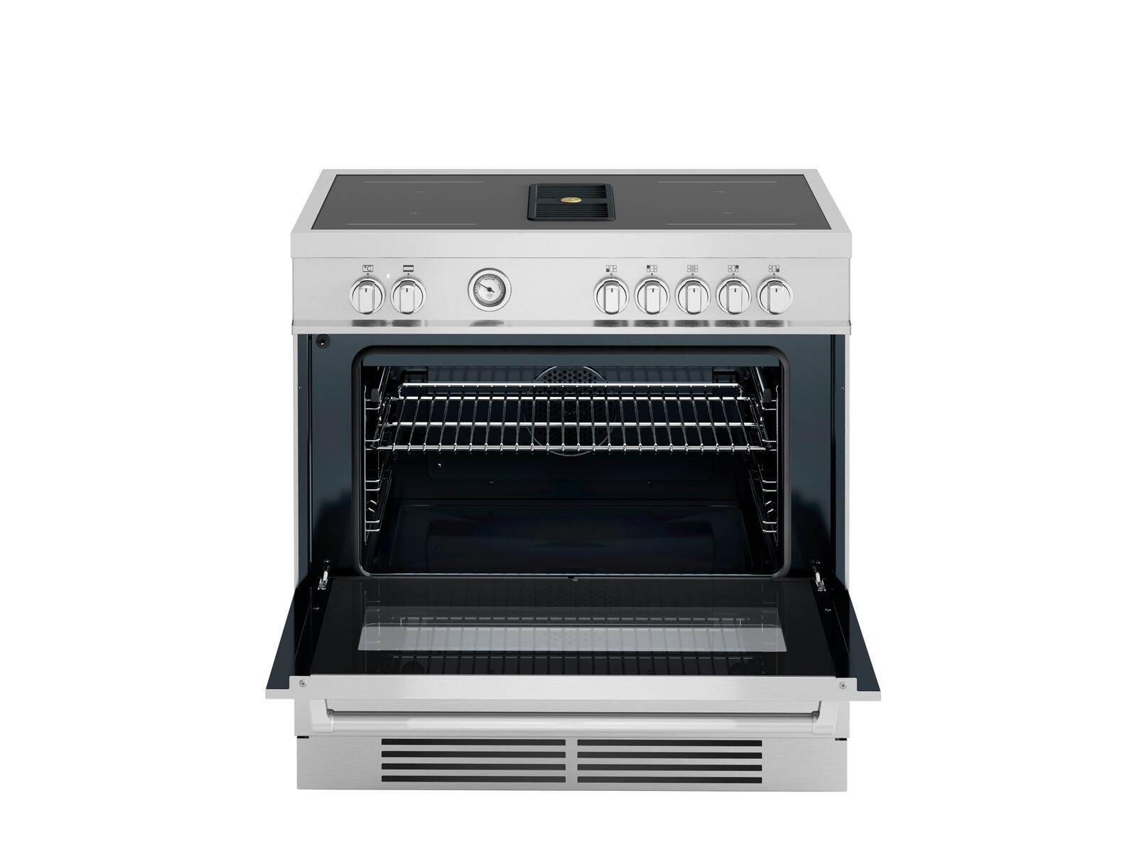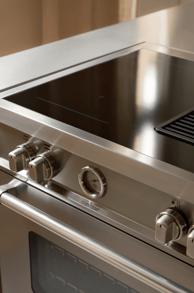 Płyta grzewcza wyposażona jest w 4 strefy indukcyjne sterowane ergonomicznymi metalowymi pokrętłami. Technologia multi-zone umożliwia połączenie dwóch stref w jedną większą, odpowiednią do dużych garnków.